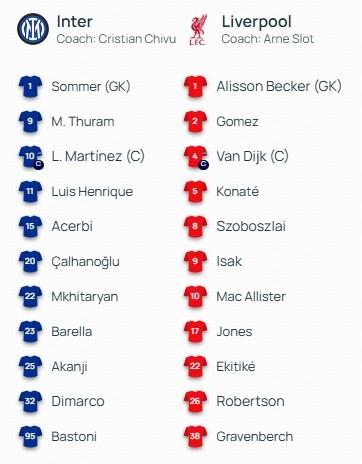 利物浦首發(fā):1-阿利松、2-喬-戈麥斯、4-范戴克、5-科納特、8-索博斯洛伊、9-伊薩克、10-麥卡利斯特、17-柯蒂斯-瓊斯、22-埃基蒂克、26-羅伯遜、38-赫拉芬貝赫
