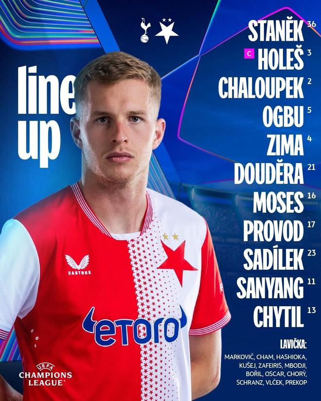 布拉格斯拉維亞首發:36-斯塔涅克、3-霍萊什、2-哈勞佩克、5-奧布、4-齊馬、21-道杰拉、16-摩西、17-普羅沃德、23-薩迪萊克、11-薩尼揚、13-希季爾